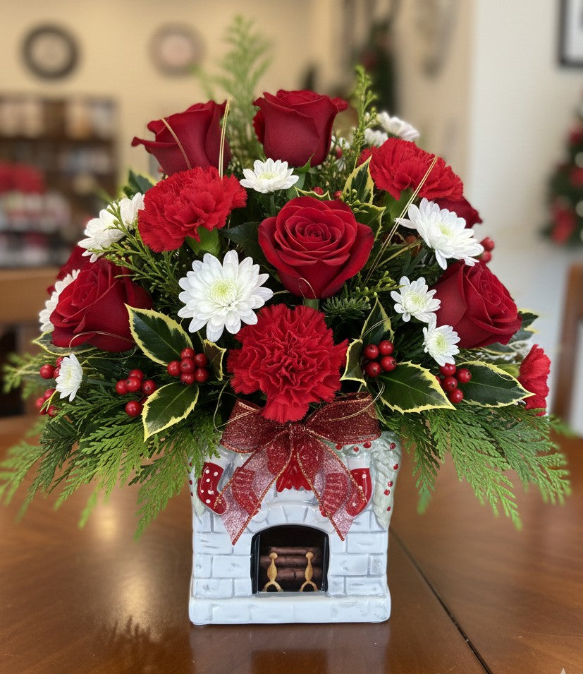 Bring the cozy charm of a crackling fireplace into their home this holiday season! Our "Fireside Christmas" arrangement is the perfect blend of traditional elegance and whimsical Christmas cheer.